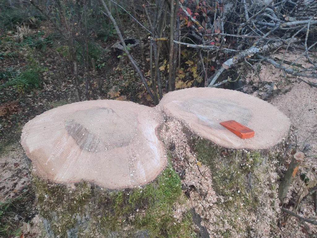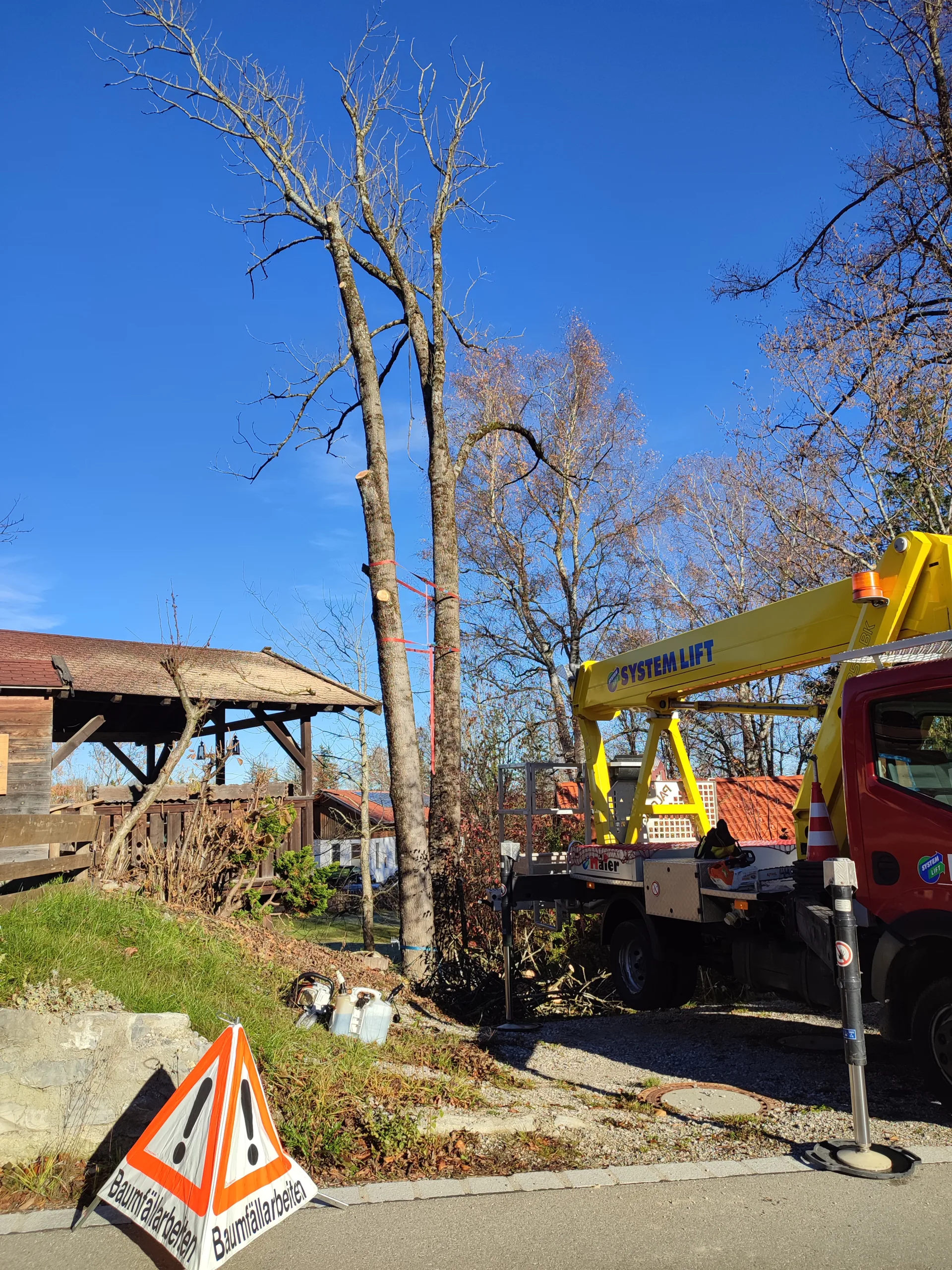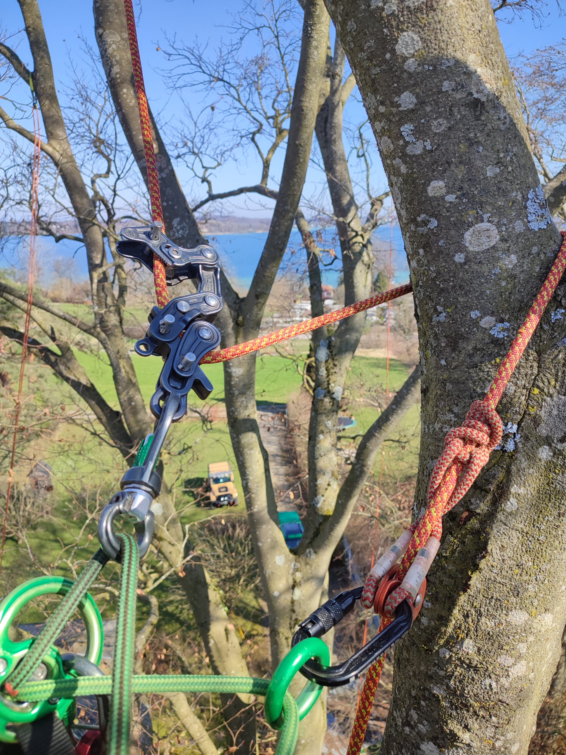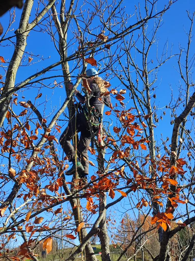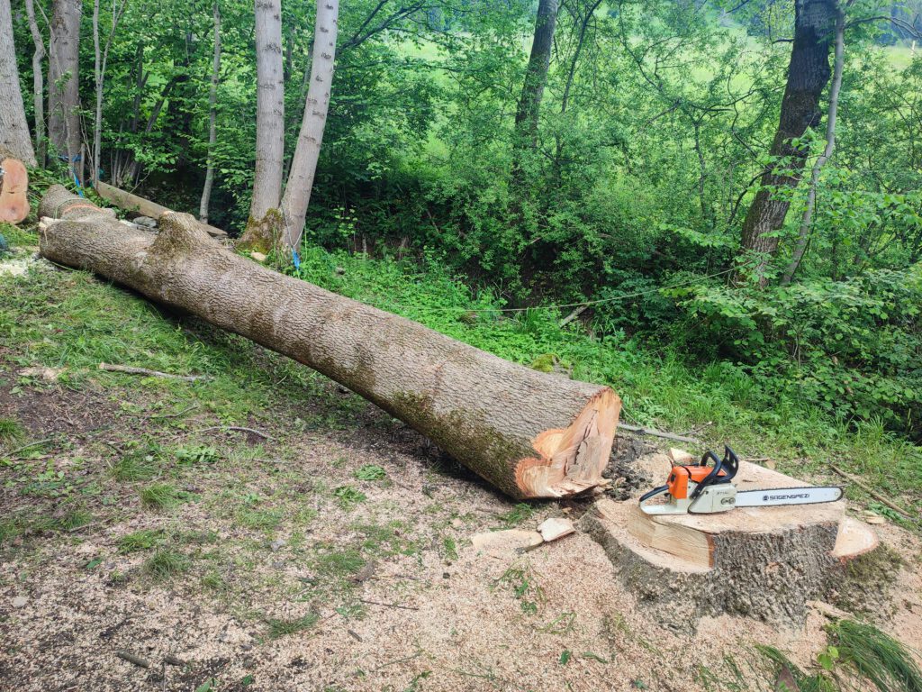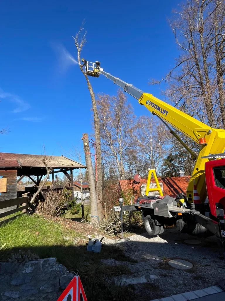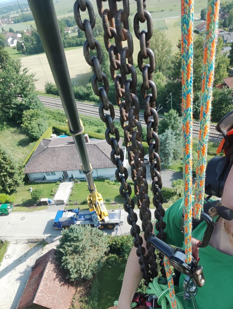 Aufgrund einer bereits fortgeschrittenen Fäule im Stammfuß sowie einer Neigung über eine Hütte, mussten wir die Esche mithilfe von Seilklettertechnik und Rigging (Abseiltechniken) Stück für Stück abtragen. Das Material wurde aus dem Grundstück geschafft, konnte dann allerdings vor Ort bleiben.