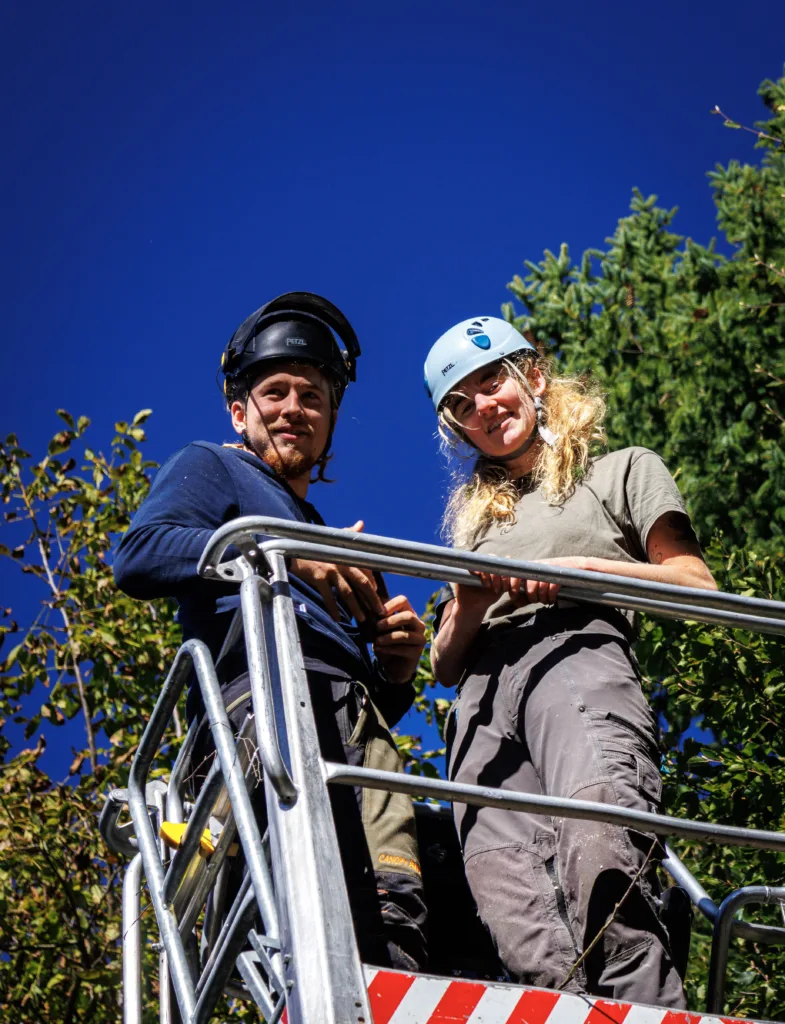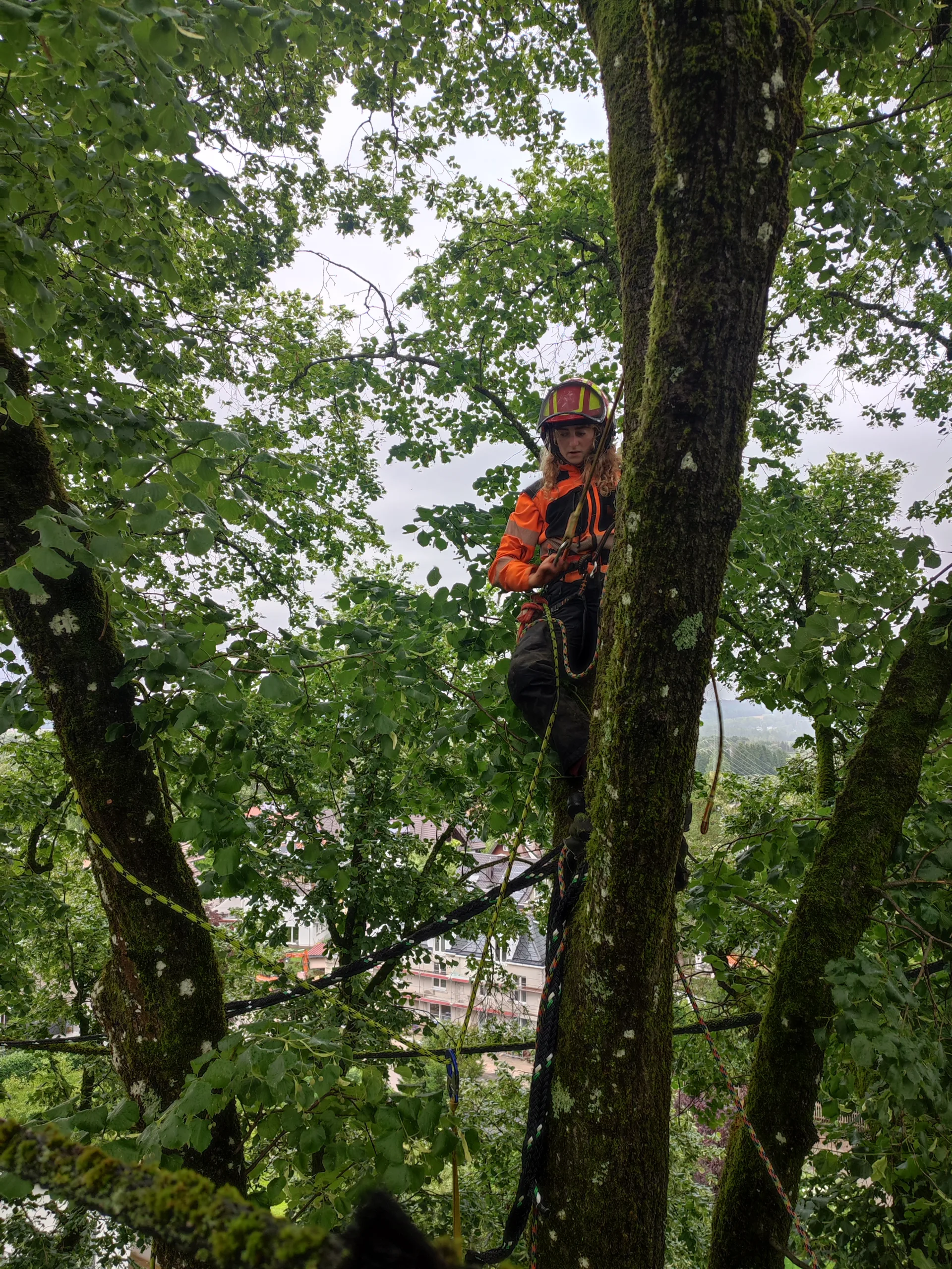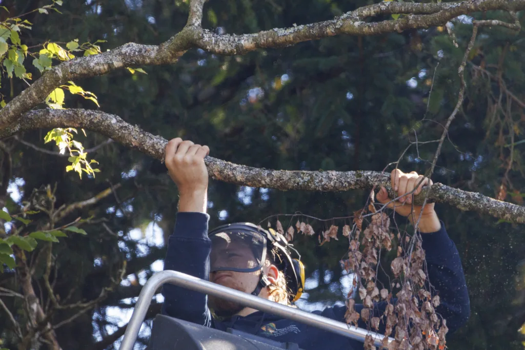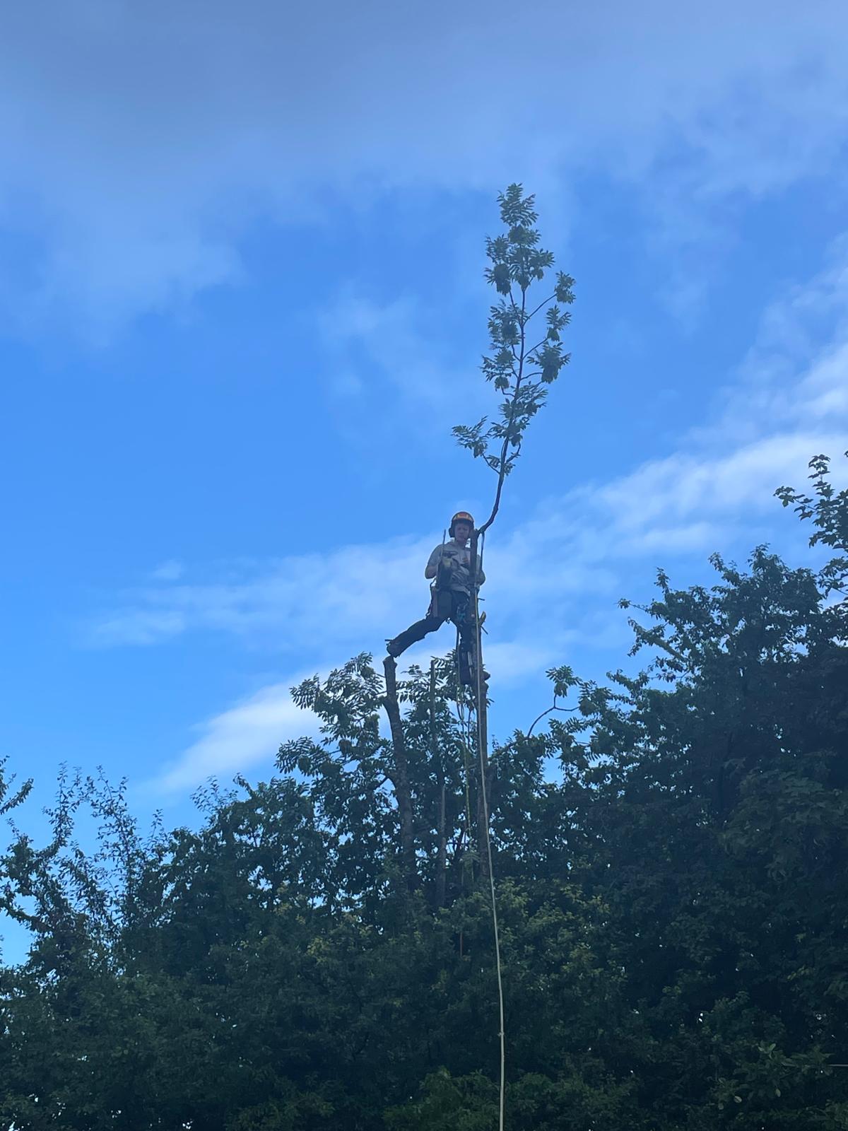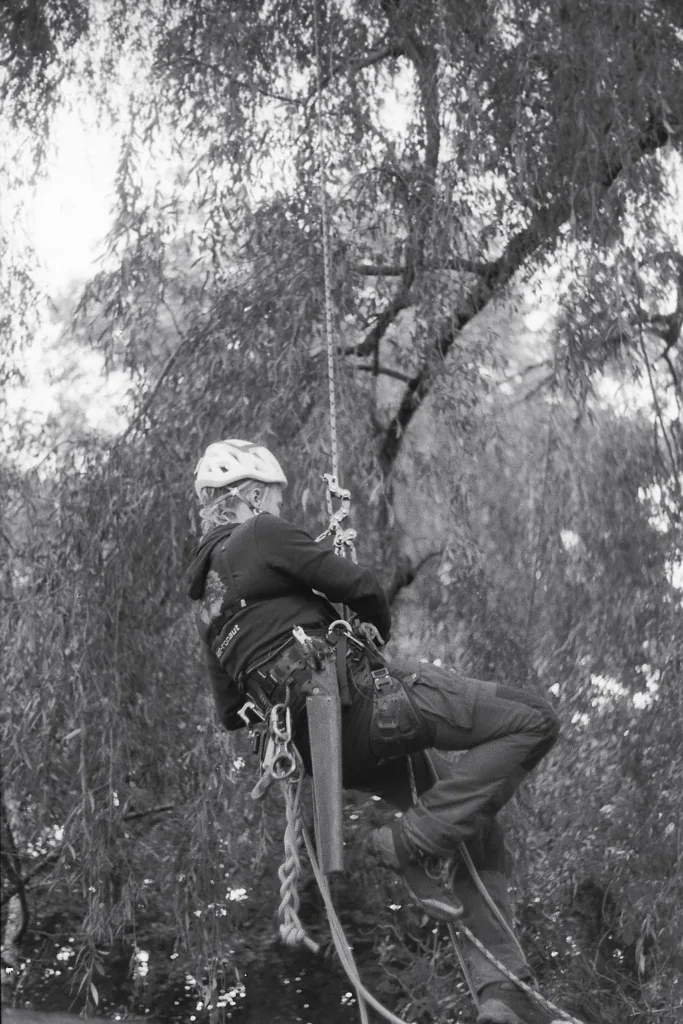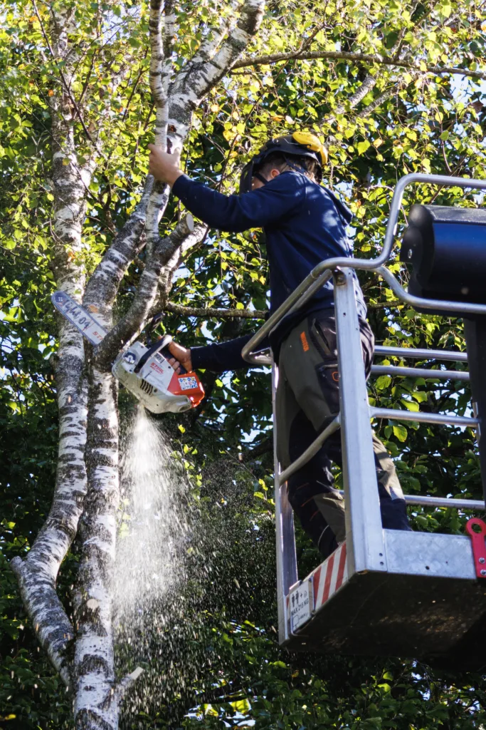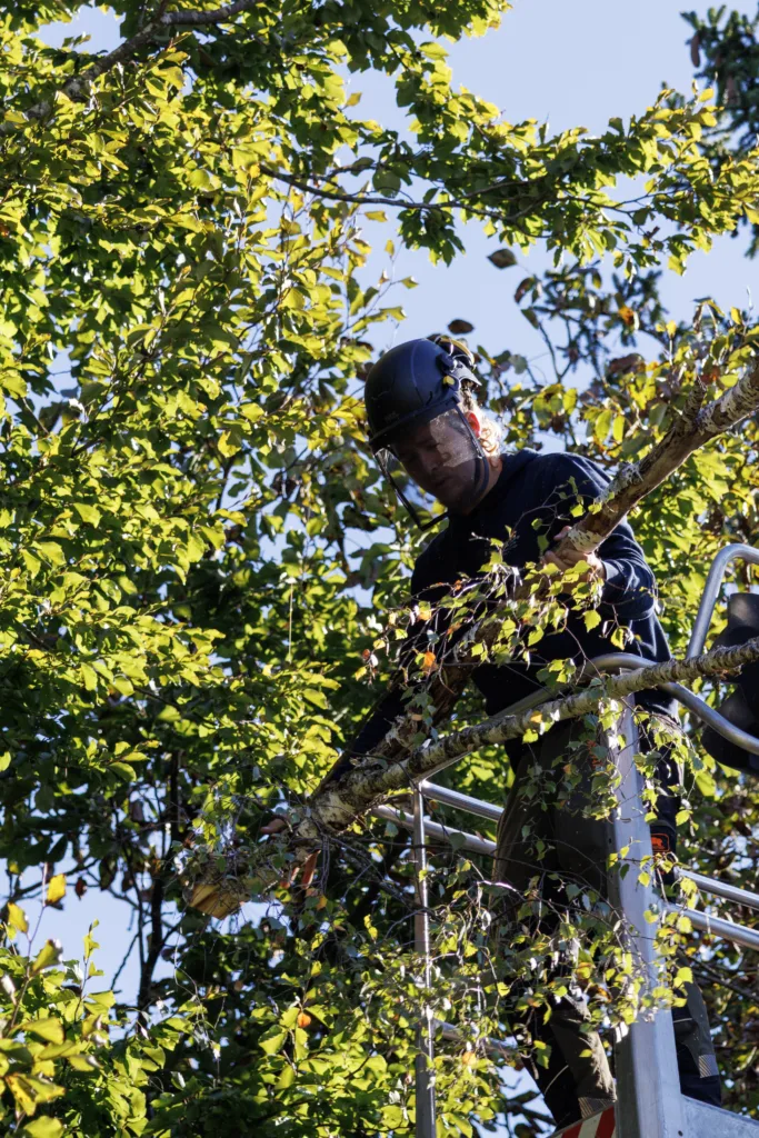 Aufgrund einer bereits fortgeschrittenen Fäule im Stammfuß sowie einer Neigung über eine Hütte, mussten wir die Esche mithilfe von Seilklettertechnik und Rigging (Abseiltechniken) Stück für Stück abtragen. Das Material wurde aus dem Grundstück geschafft, konnte dann allerdings vor Ort bleiben.