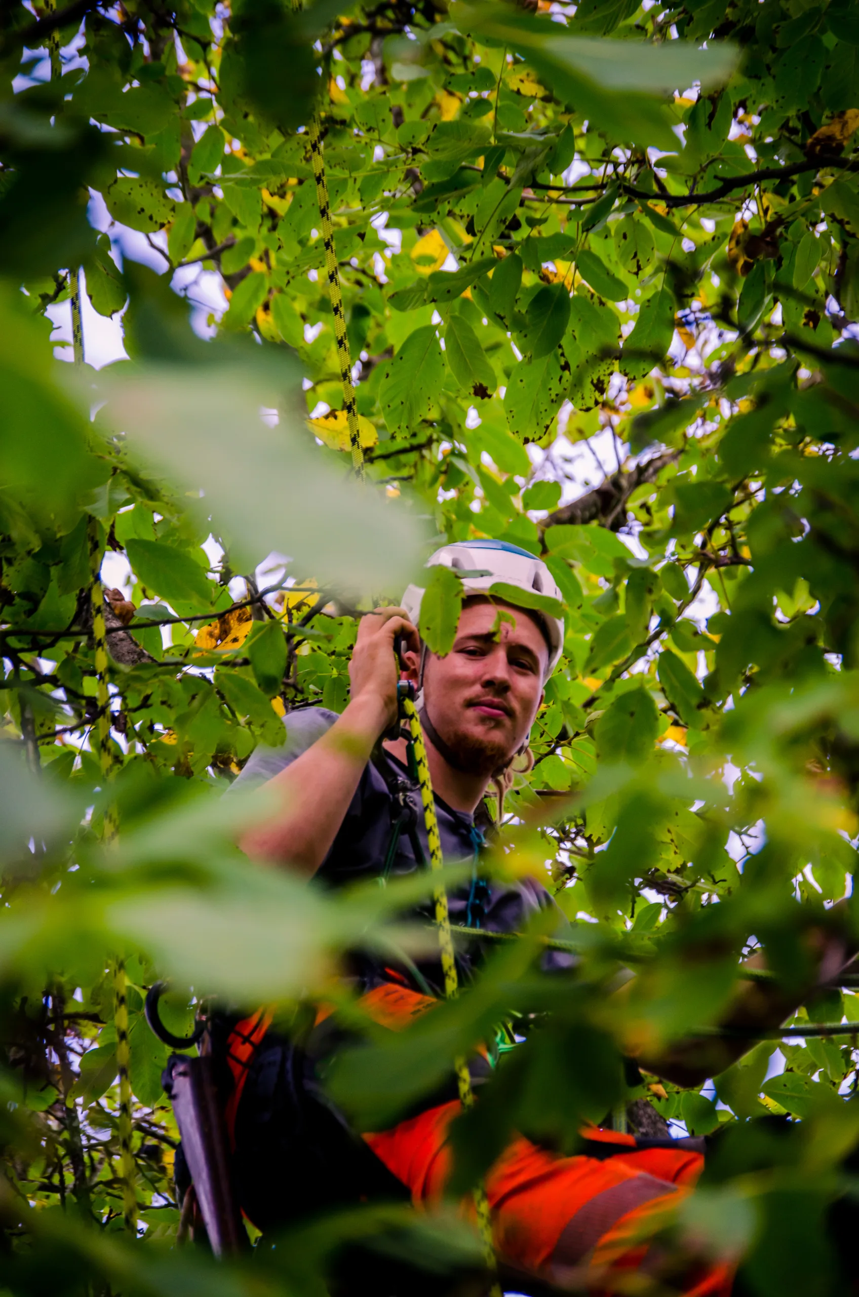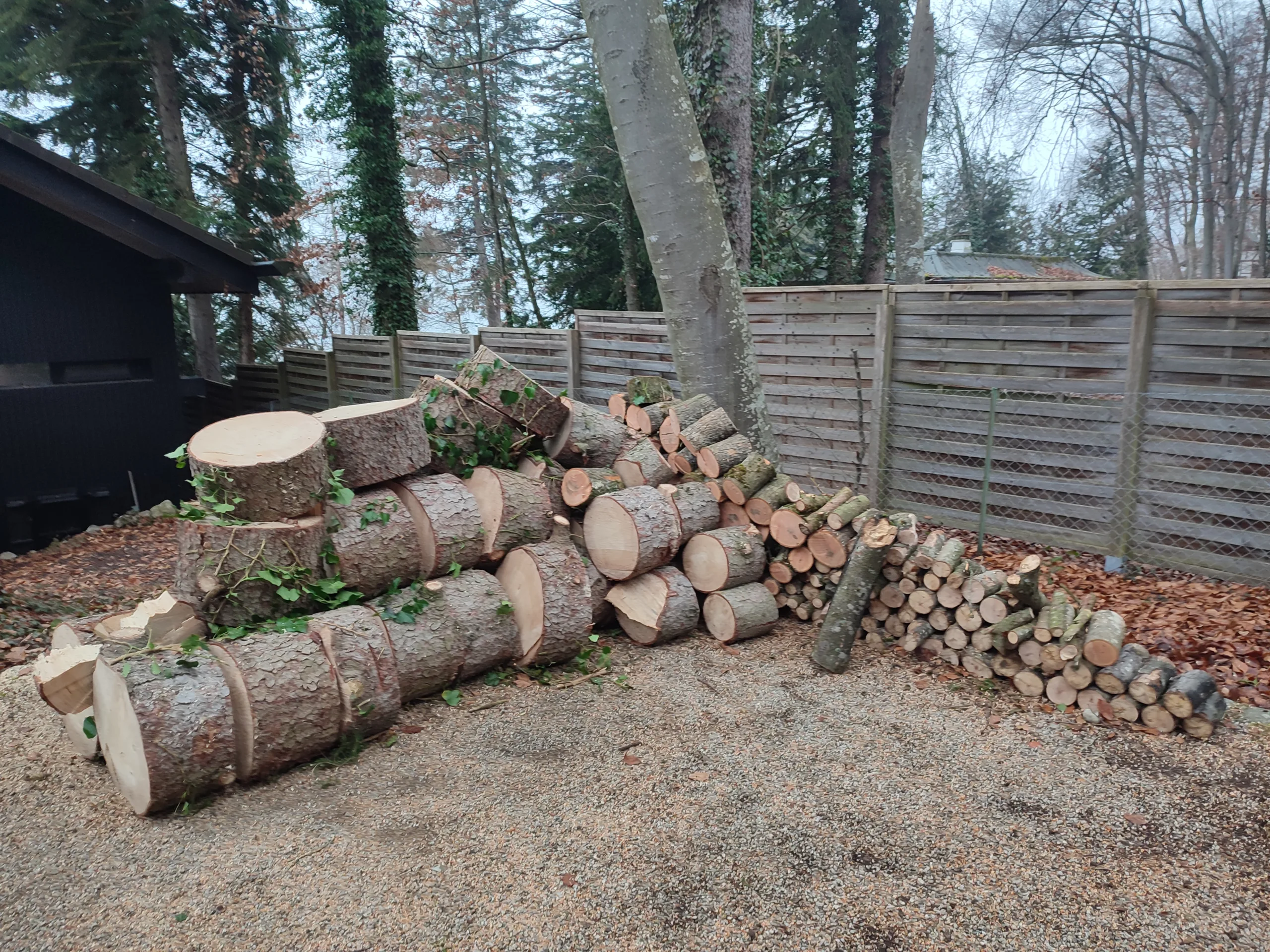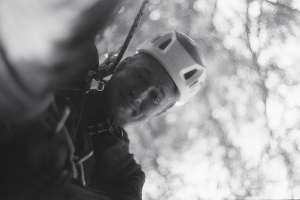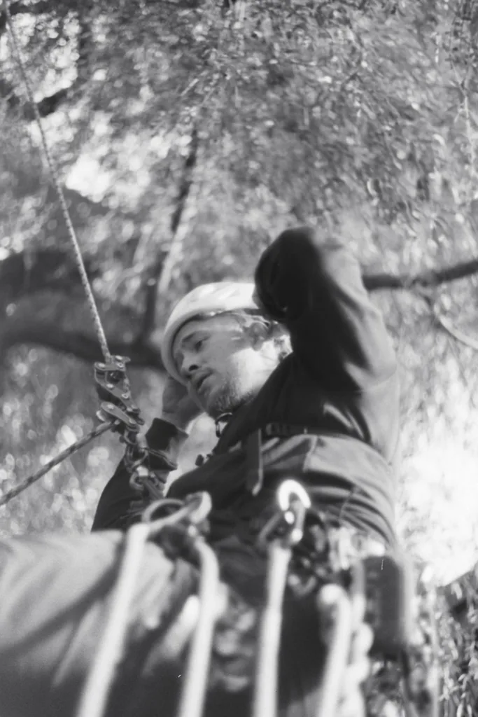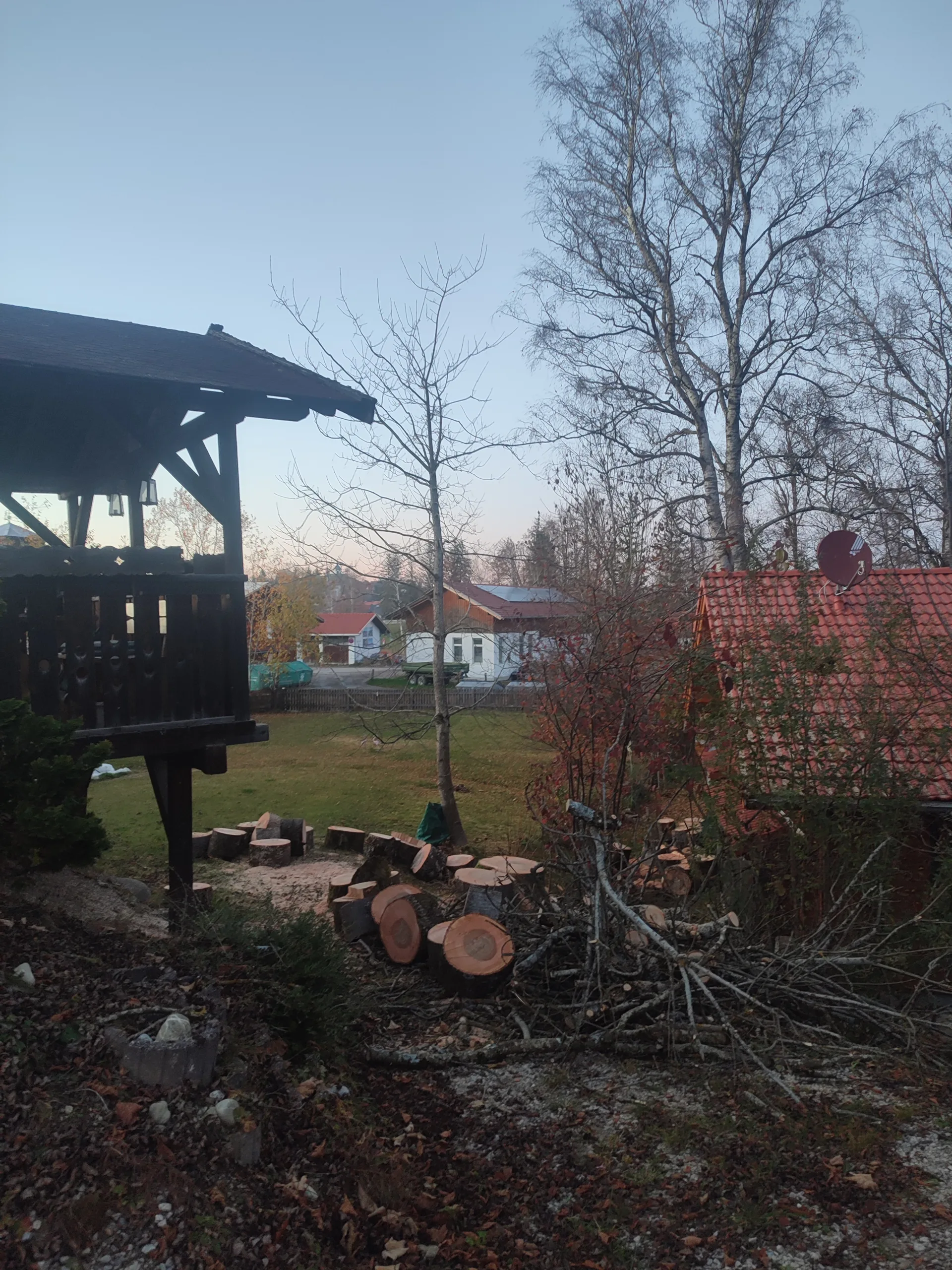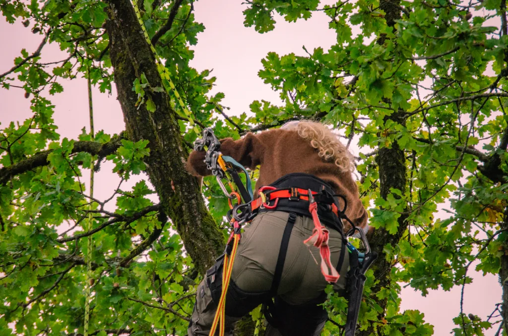 Aufgrund einer bereits fortgeschrittenen Fäule im Stammfuß sowie einer Neigung über eine Hütte, mussten wir die Esche mithilfe von Seilklettertechnik und Rigging (Abseiltechniken) Stück für Stück abtragen. Das Material wurde aus dem Grundstück geschafft, konnte dann allerdings vor Ort bleiben.