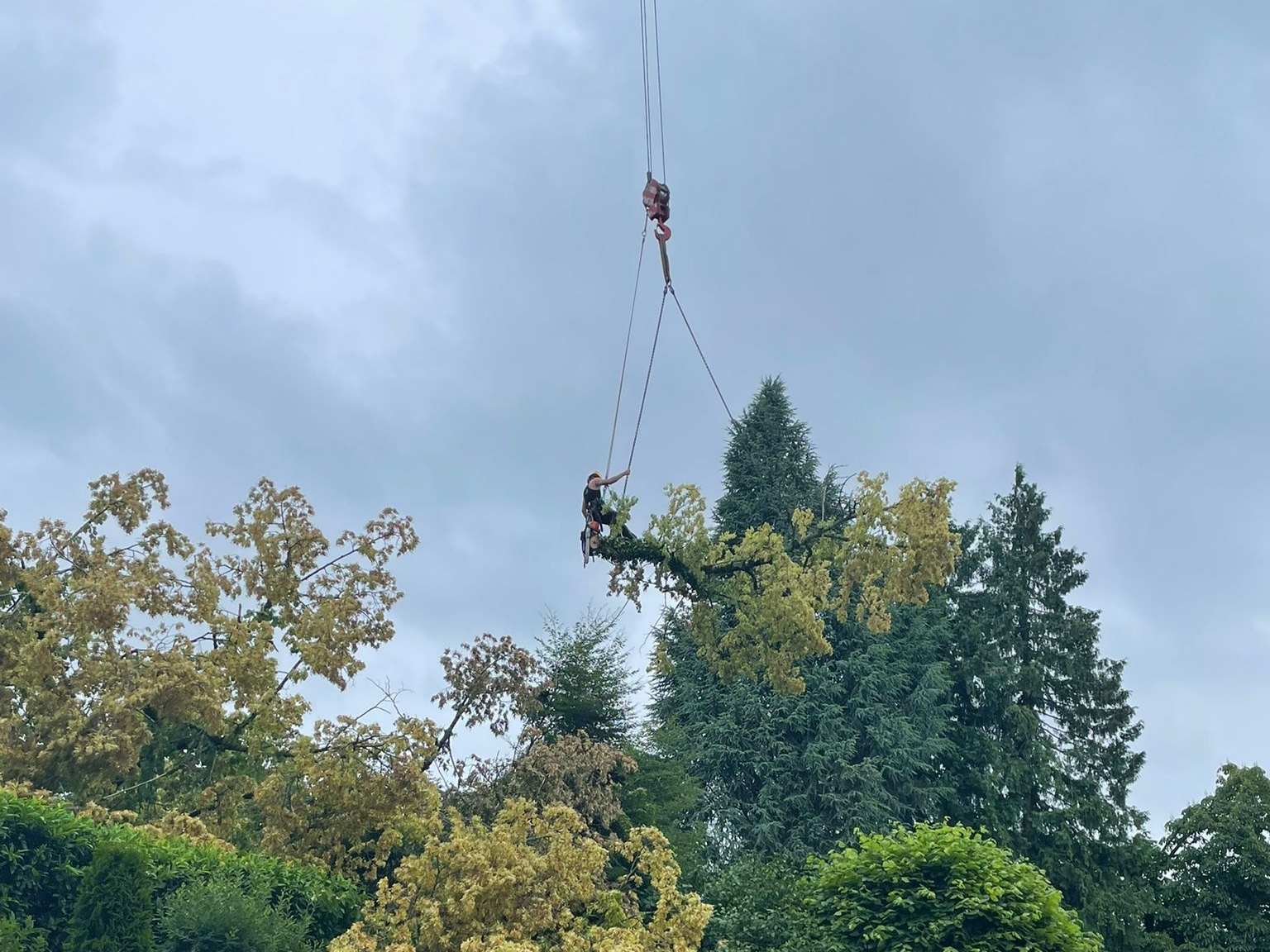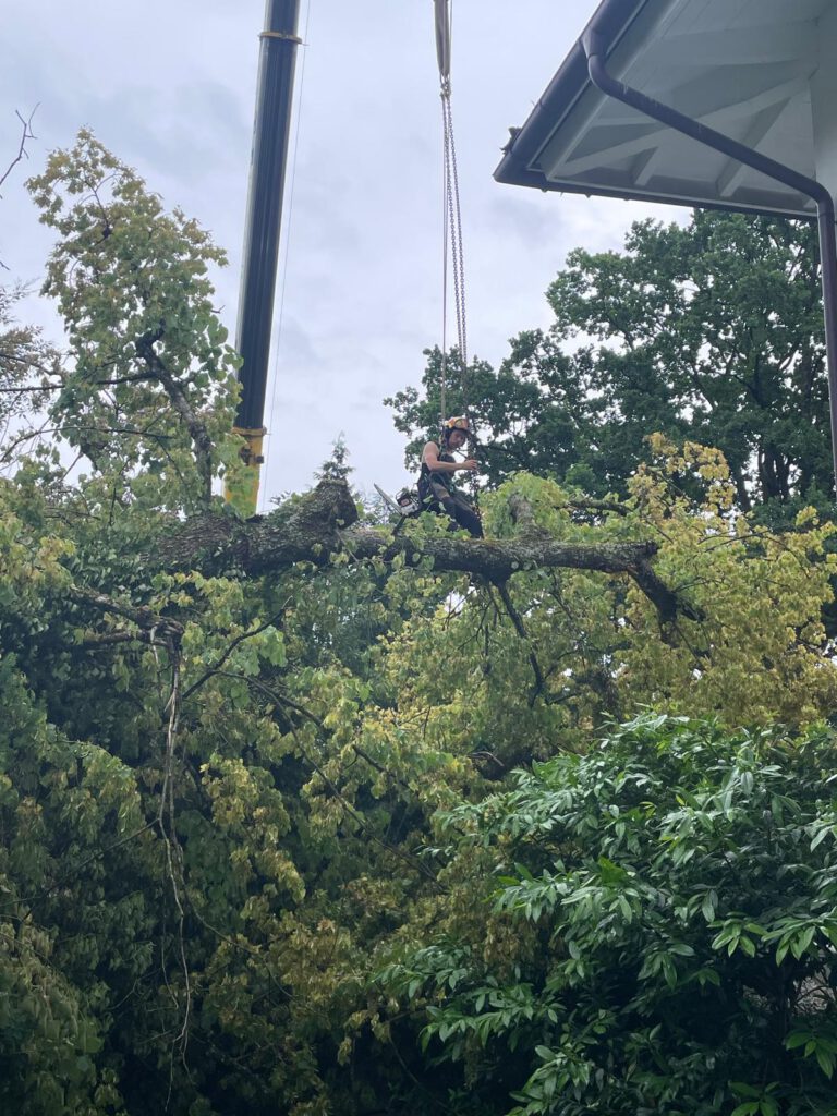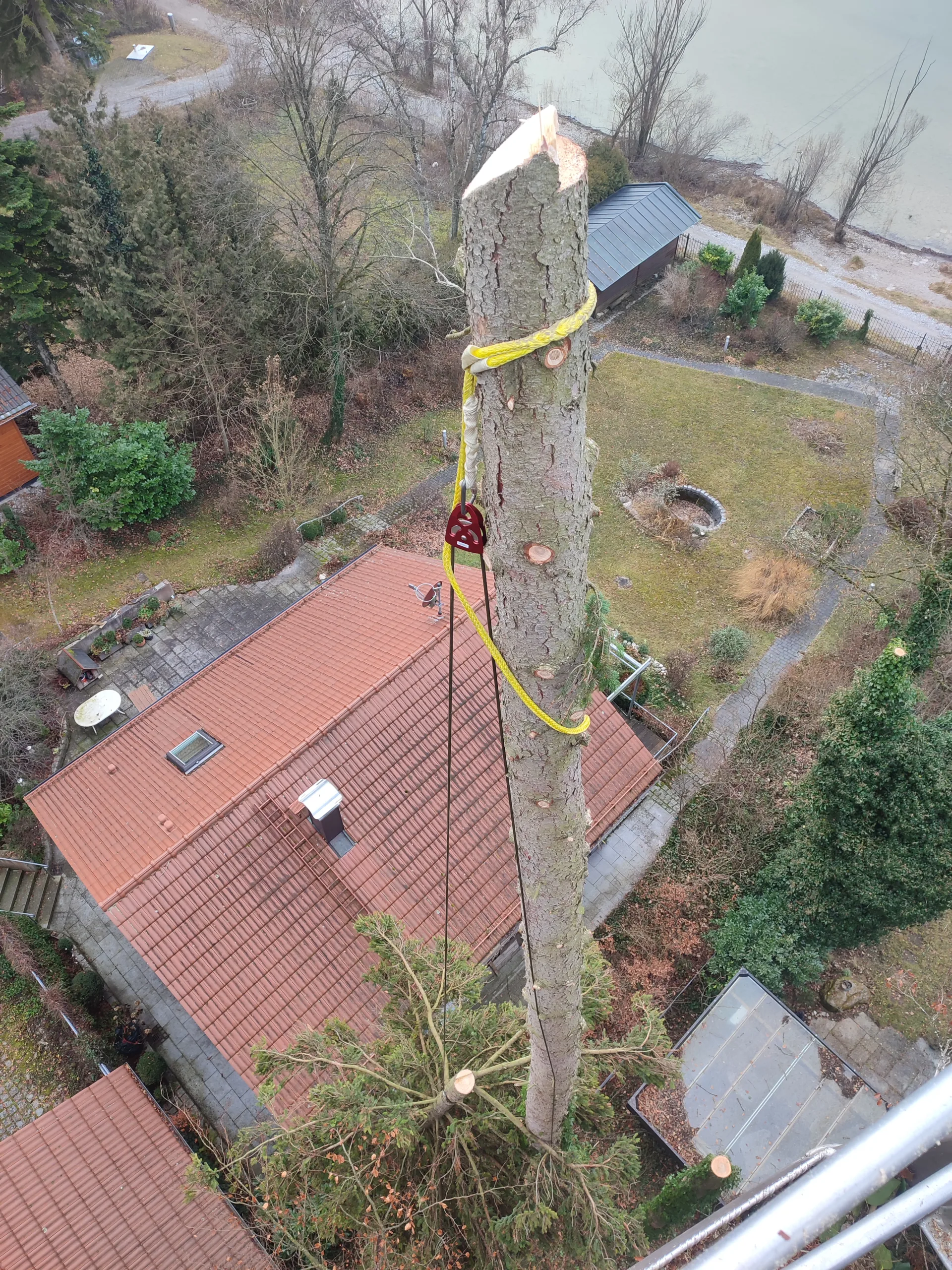 Um den Teich und die Beete im Garten bestmöglich zu schützen, wurde ein großer Teil der Krone per Speedline (Seilbahn) direkt über die Grundstücksgrenze hinaus abgeseilt.