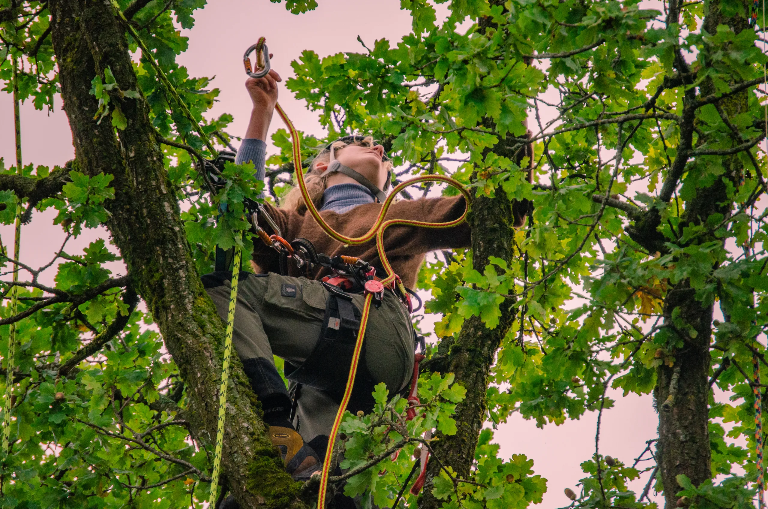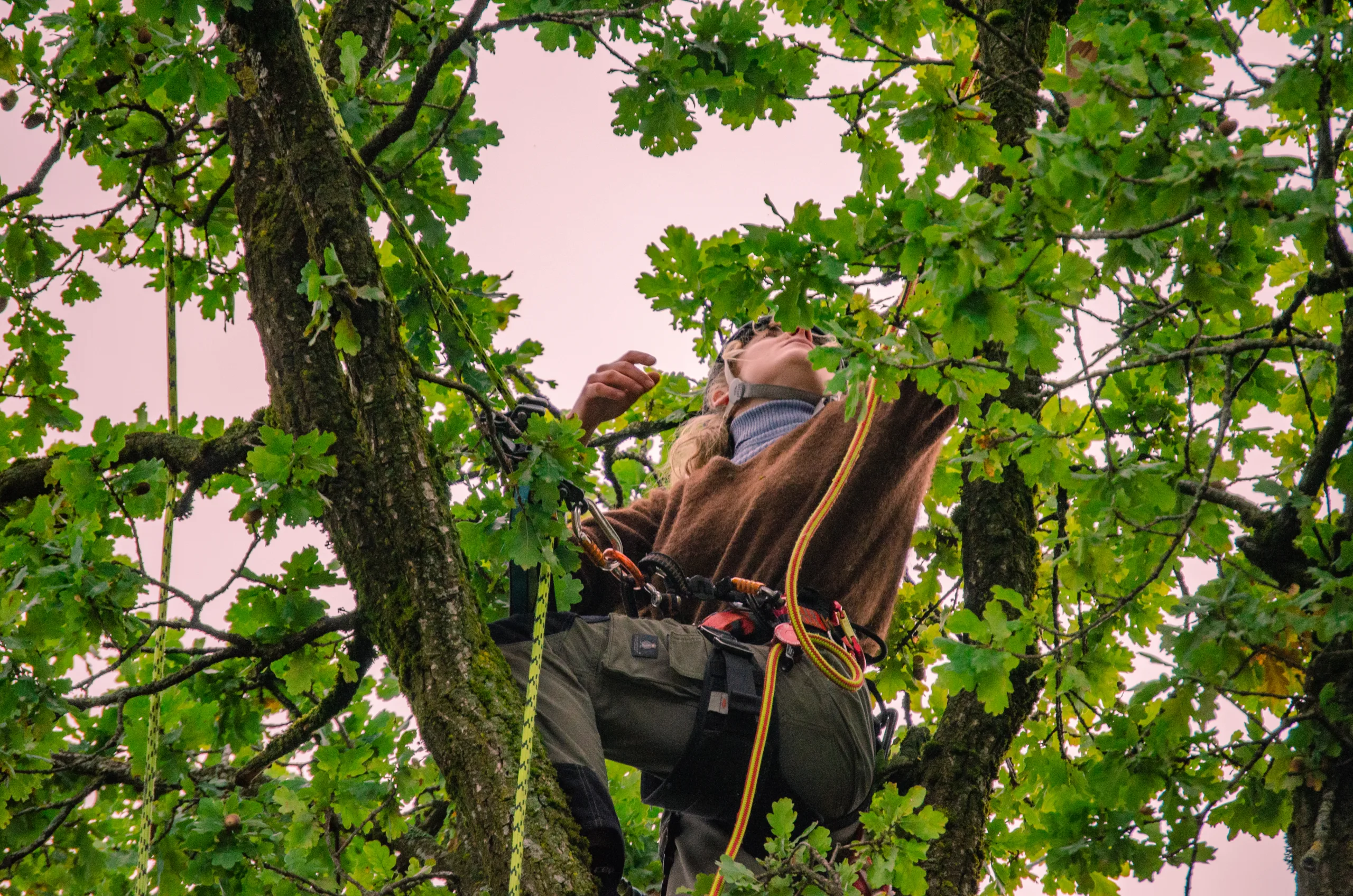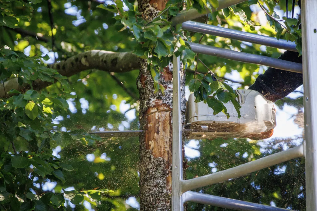 Um den Teich und die Beete im Garten bestmöglich zu schützen, wurde ein großer Teil der Krone per Speedline (Seilbahn) direkt über die Grundstücksgrenze hinaus abgeseilt.