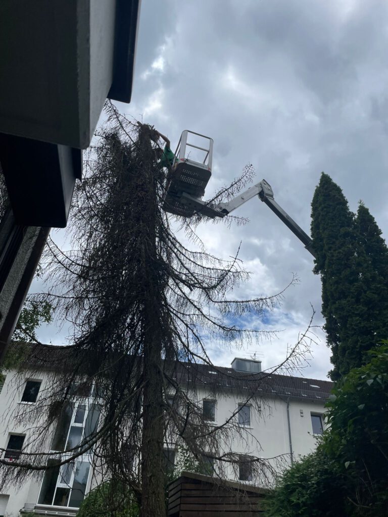 Bergung einer entwurzelten Esche. Bei der Besichtigung konnten wir die gleichen Schäden an drei weiteren Eschen feststellen. Zwei davon konnten wir auf einen Öko-Torso zurückschneiden. Auf Wunsch der Eigentümer haben wir zuletzt noch eine 34m hohe Fichte zwischen den Häusern abgetragen. Den Reststamm dürfen wir ebenso als Öko-Torso noch einige Jahre stehen lassen.
