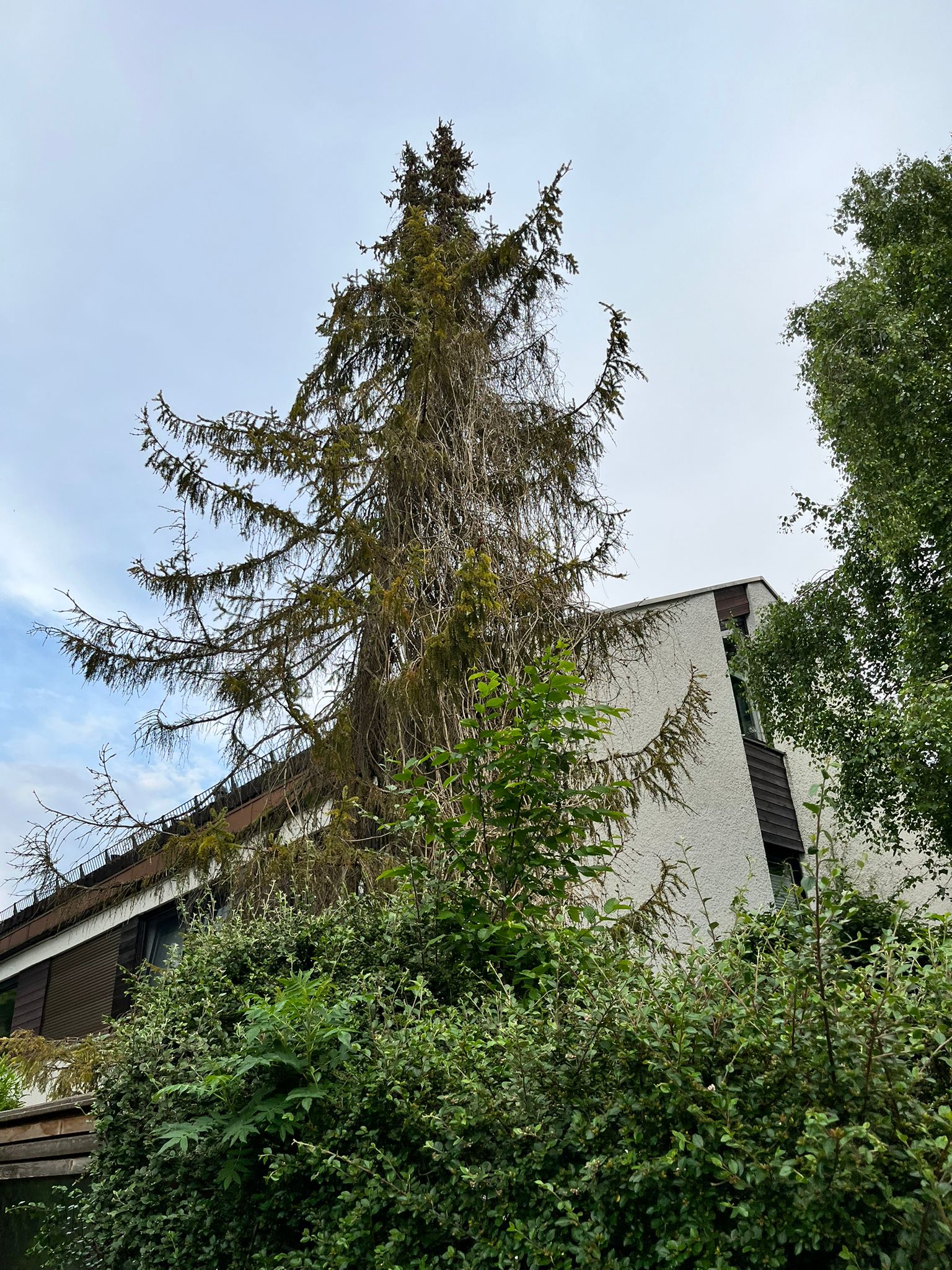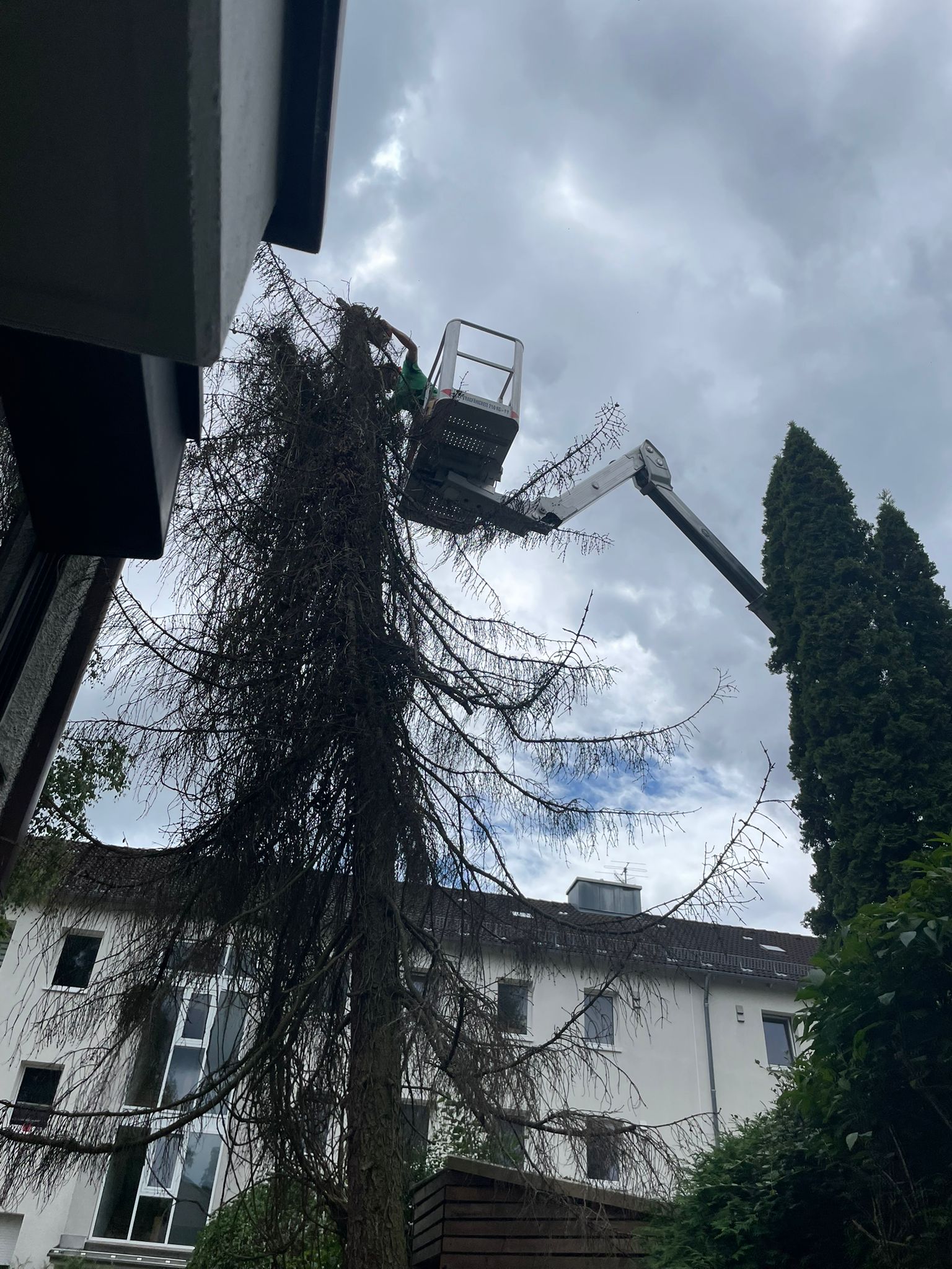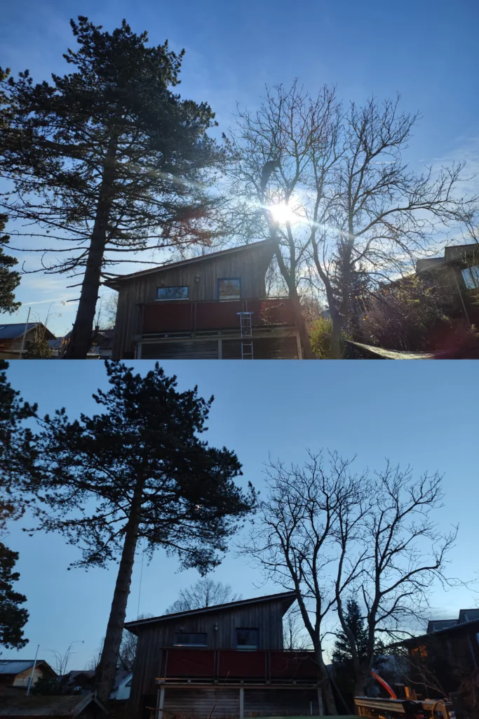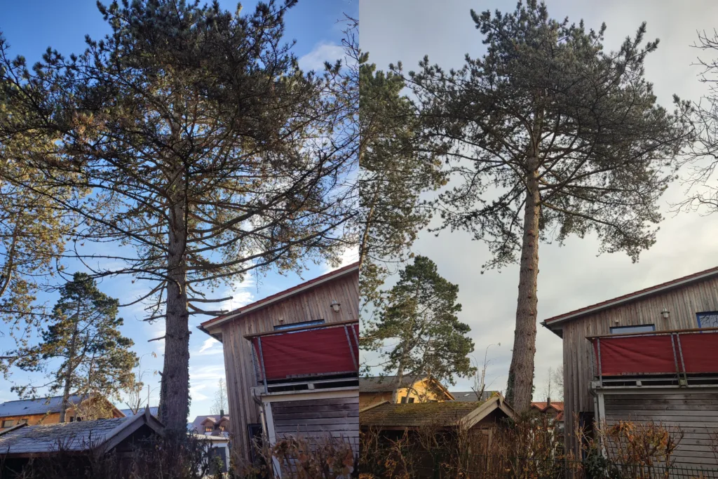 Totholzentfernung und Einkürzung der überlangen Äste in Richtung Dach an einer Kiefer;