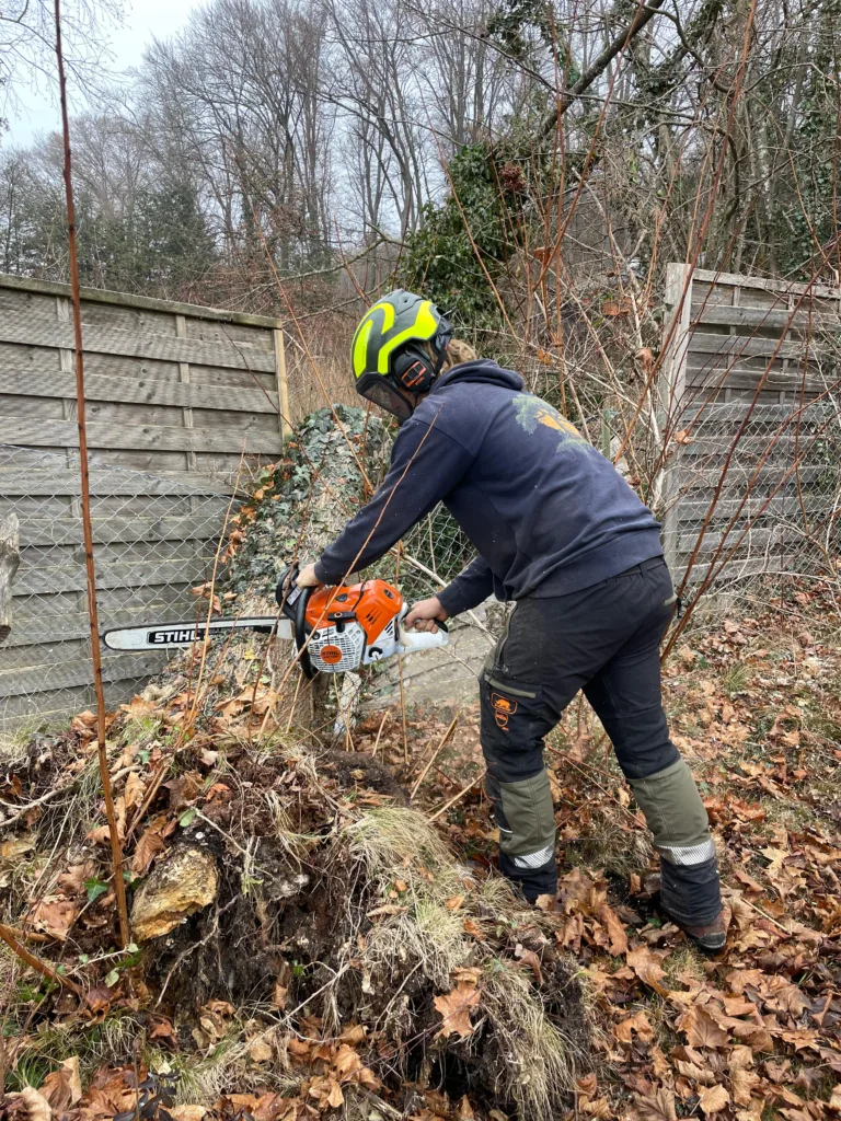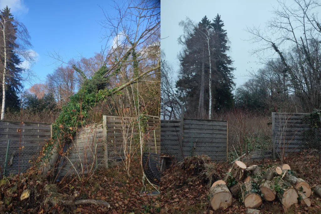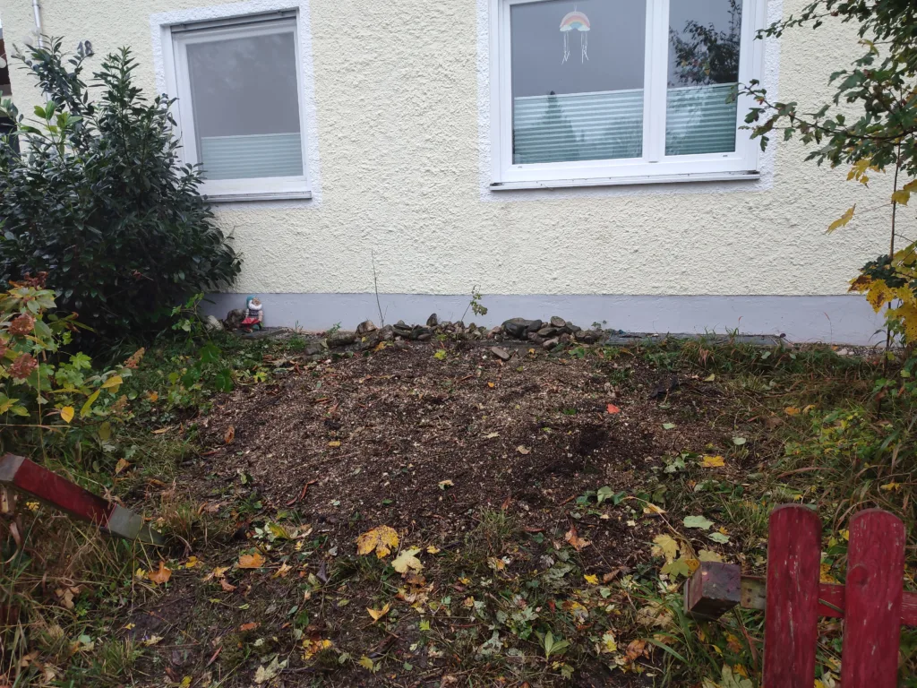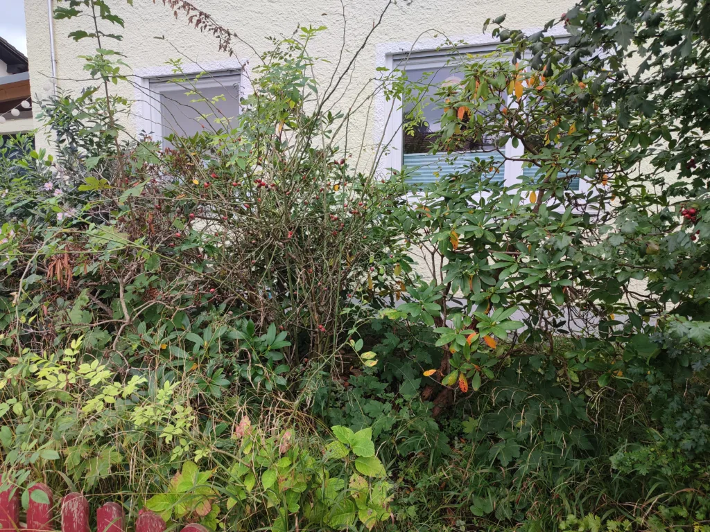Entfernung von verschiedenen Gehölzen sowie eines Wurzelstocks mit ca 30cm Durchmesser. Hier wurde Platz geschaffen für den Bau einer Fahrradgarage.