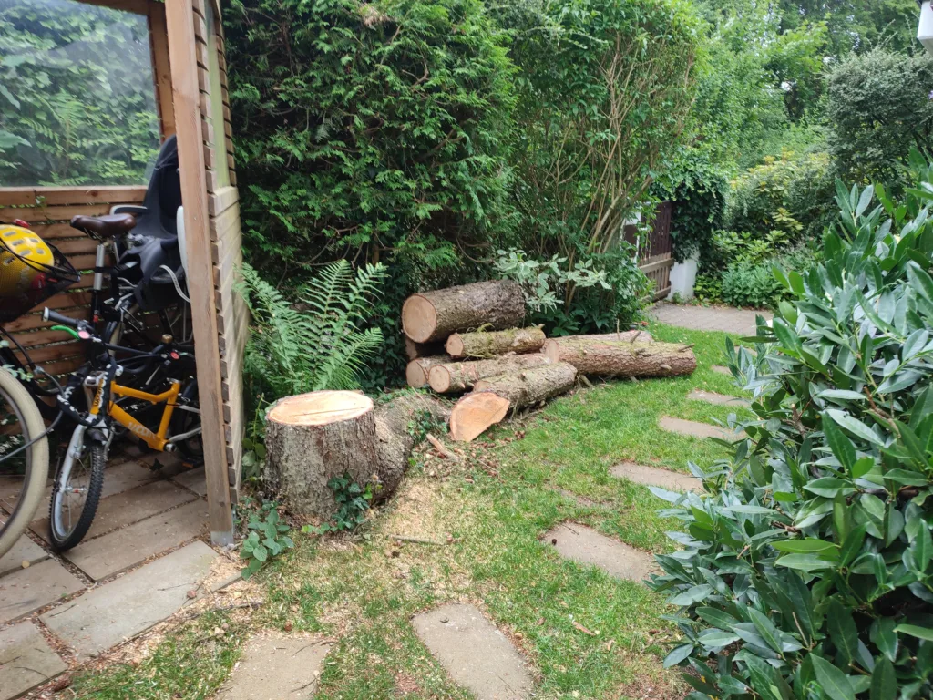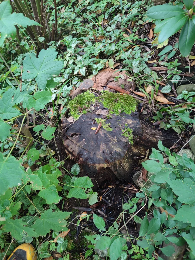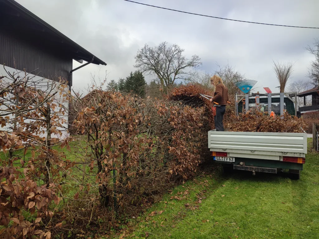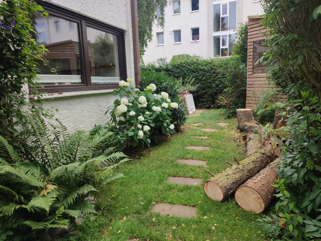 Entfernung von verschiedenen Gehölzen sowie eines Wurzelstocks mit ca 30cm Durchmesser. Hier wurde Platz geschaffen für den Bau einer Fahrradgarage.
