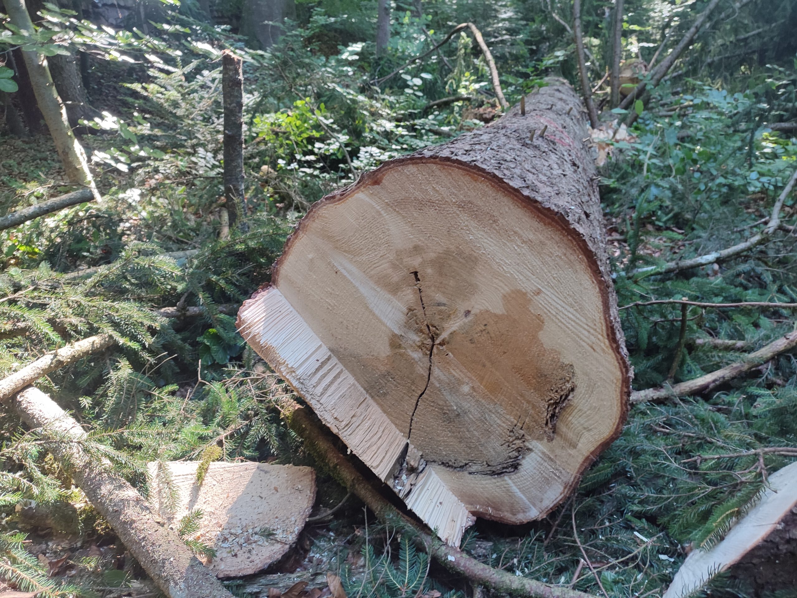Fällung einer abgestorbenen Fichte. Die Stammware bleibt auf Wunsch vor Ort.