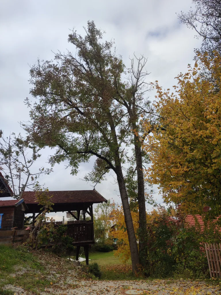 Fällung von fünf Eschen mit Eschentriebsterben. Das Holz haben wir auf Wunsch zu Brennholz geschnitten. (Hier zu sehen ist nur eine der Eschen)