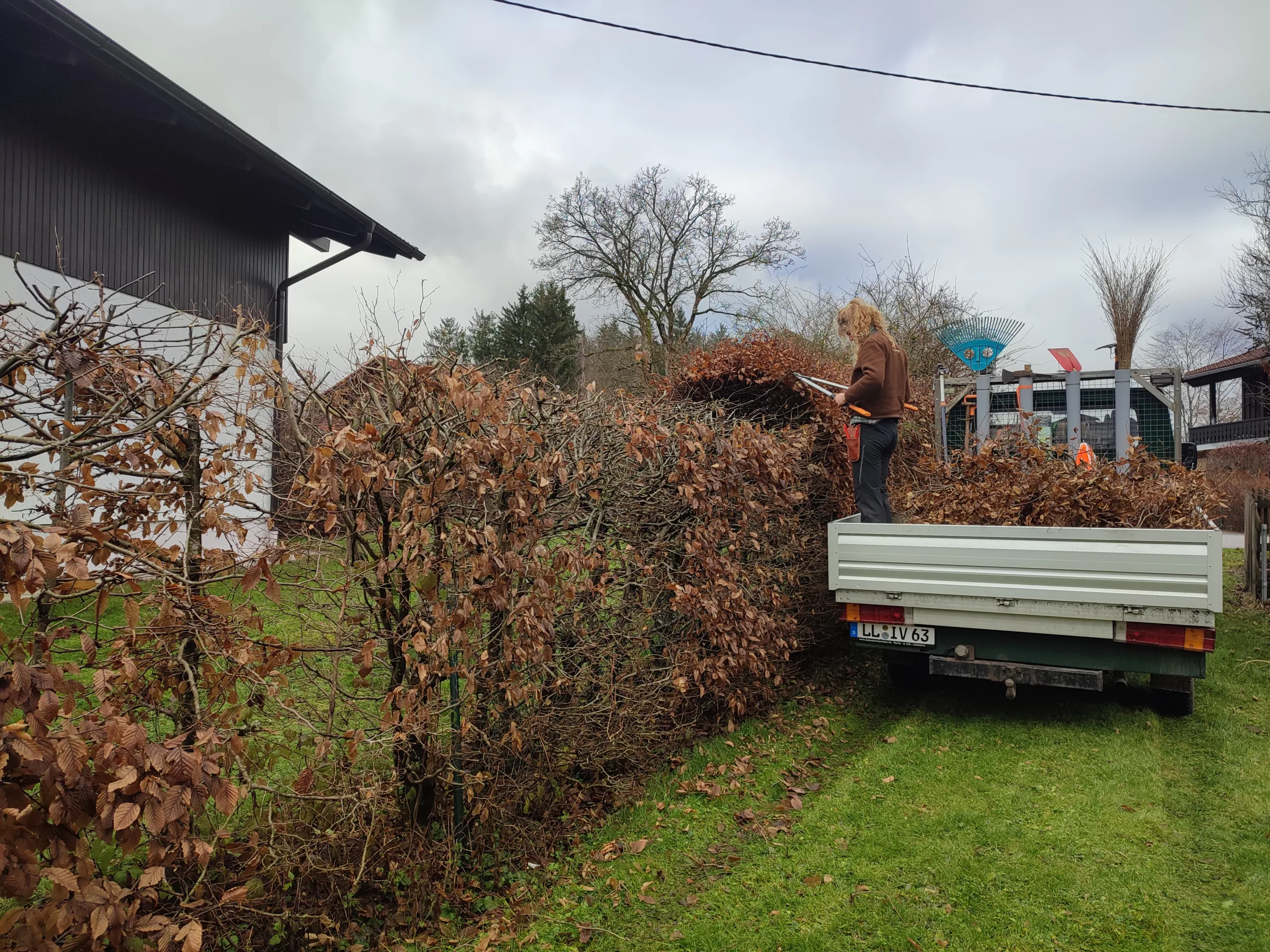 Aufgrund von behördlicher Anordnung haben wir an diesem Grundstück einen Lichtraumprofilschnitt (Freischnitt von Straßen bis 4,50m Höhe/ Gehwege bis 2,50m) durchgeführt. Außerdem haben wir einen Durchgang wieder freigeschnitten.